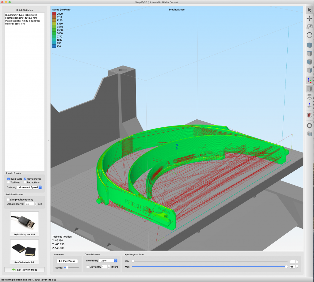 I use a type of plastic called PETG which is food safe and easy to clean even if the shields are expected to be only single-use shields. To print reliably with my setup requires 2H and 49 minutes of printing for the top part and about 30 minutes for 2 bottom parts. I am still challenging the group for the need for the bottom part full stop. The design might change over the coming weeks.